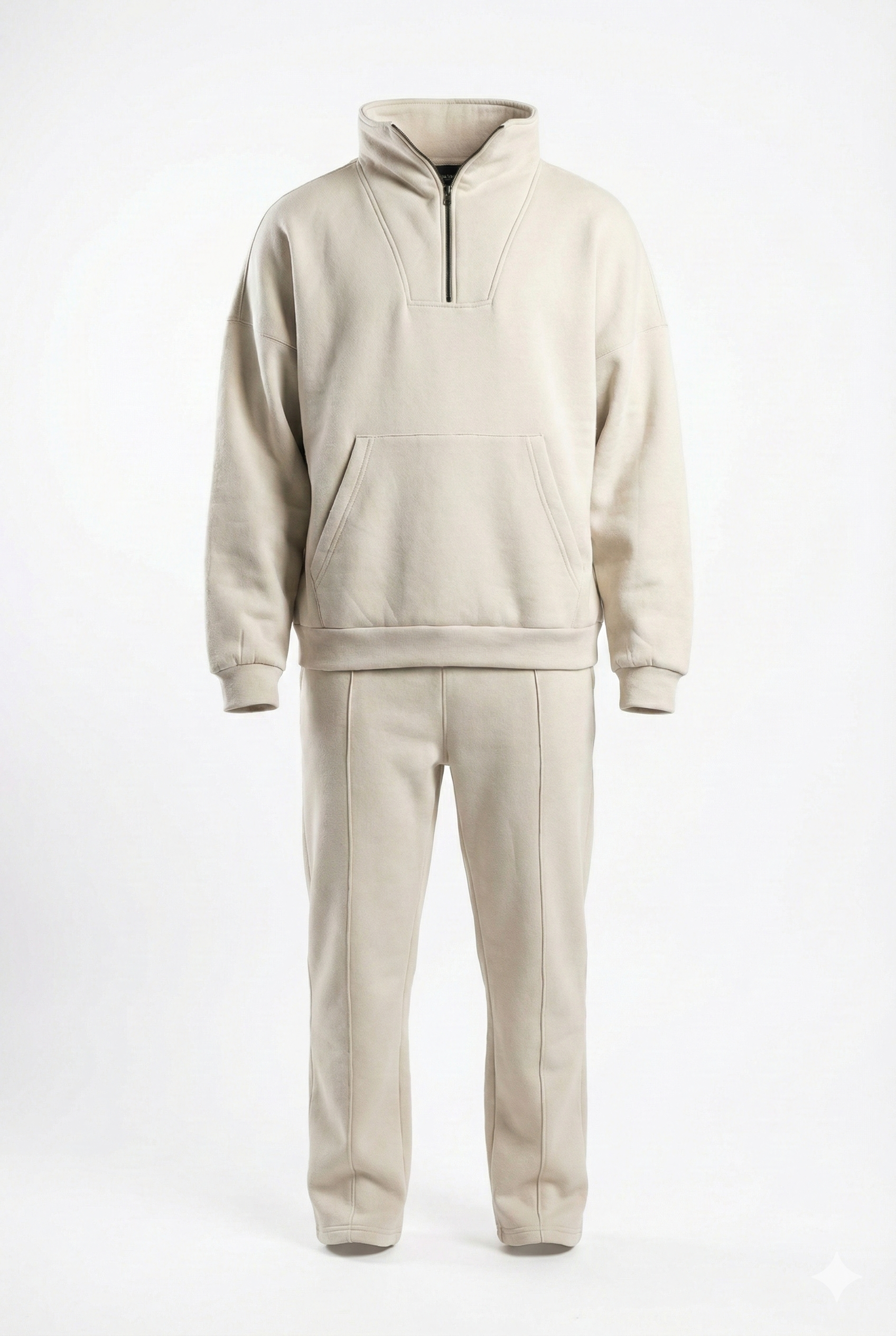 The upper features a robust half-zip pullover with a structured funnel neck and a distinct contrast black zipper, giving it a technical, modern edge. It pairs seamlessly with the matching trousers, which are cut for a relaxed yet straight fit, featuring defined seam details that maintain structure even after hours of wear.