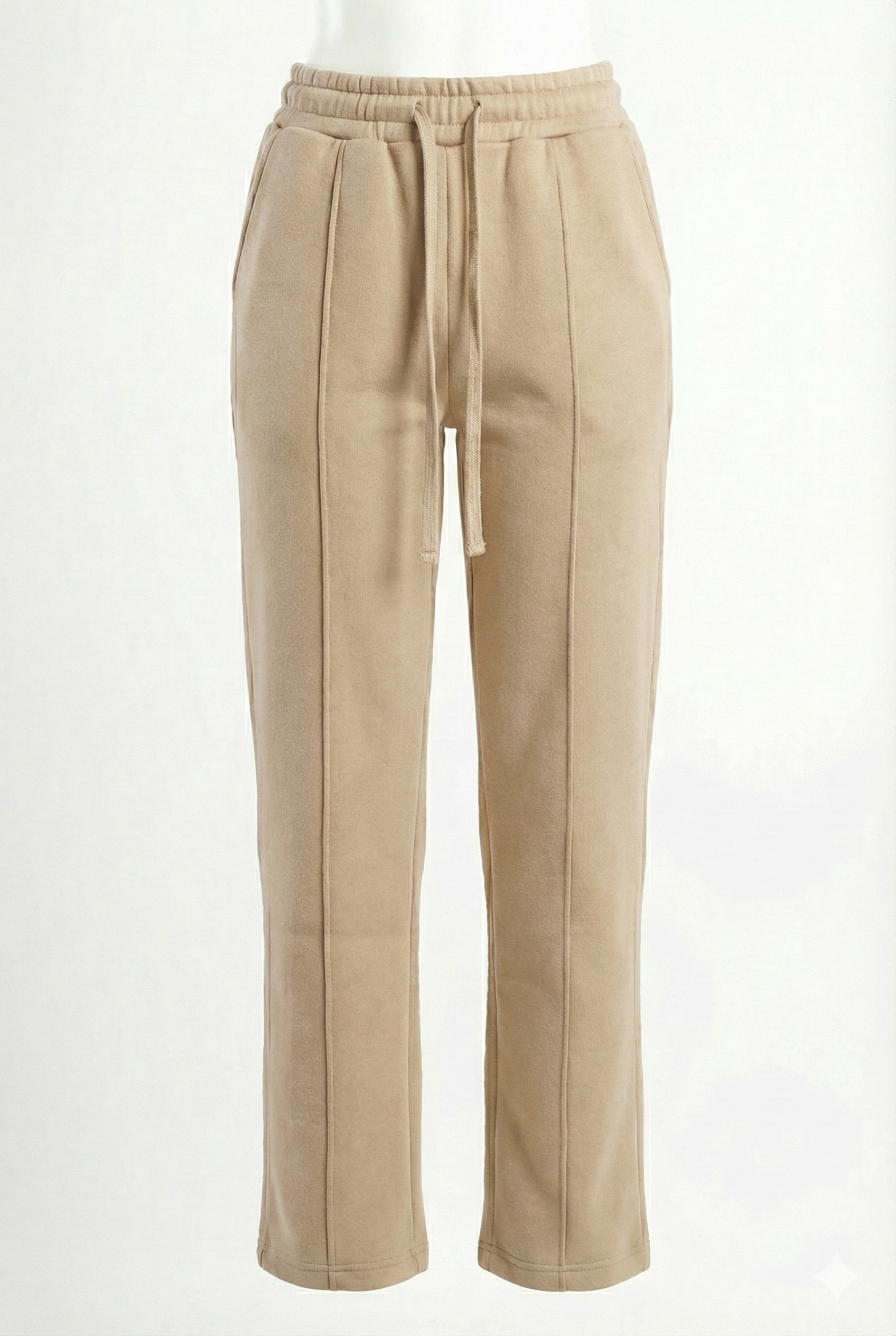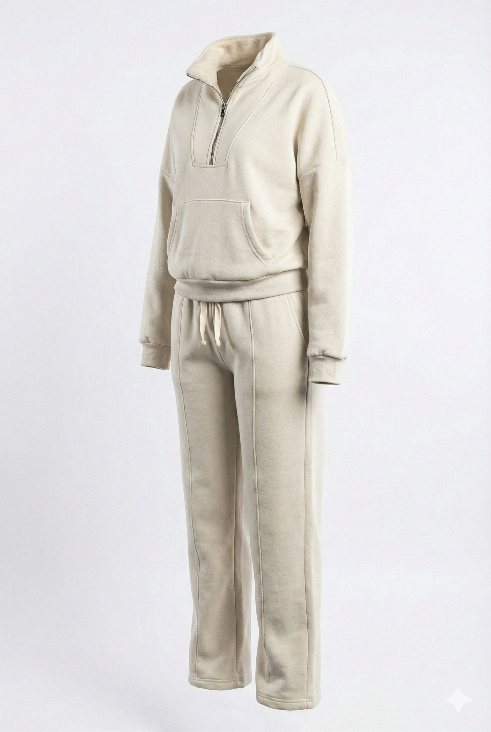 The ensemble features our signature half-zip pullover, distinguished by a sleek contrast black zipper and a high funnel neck that frames the face. It is paired with matching wide-leg trousers that feature a permanent central pintuck seam, creating a tailored vertical line that elongates the leg and elevates the look beyond standard sweats.
