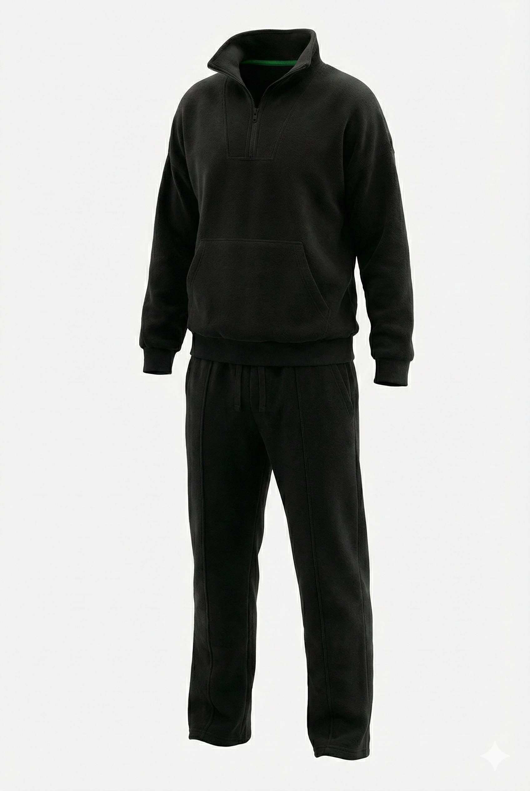 The upper features a robust half-zip pullover with a structured funnel neck and a distinct contrast black zipper, giving it a technical, modern edge. It pairs seamlessly with the matching trousers, which are cut for a relaxed yet straight fit, featuring defined seam details that maintain structure even after hours of wear.