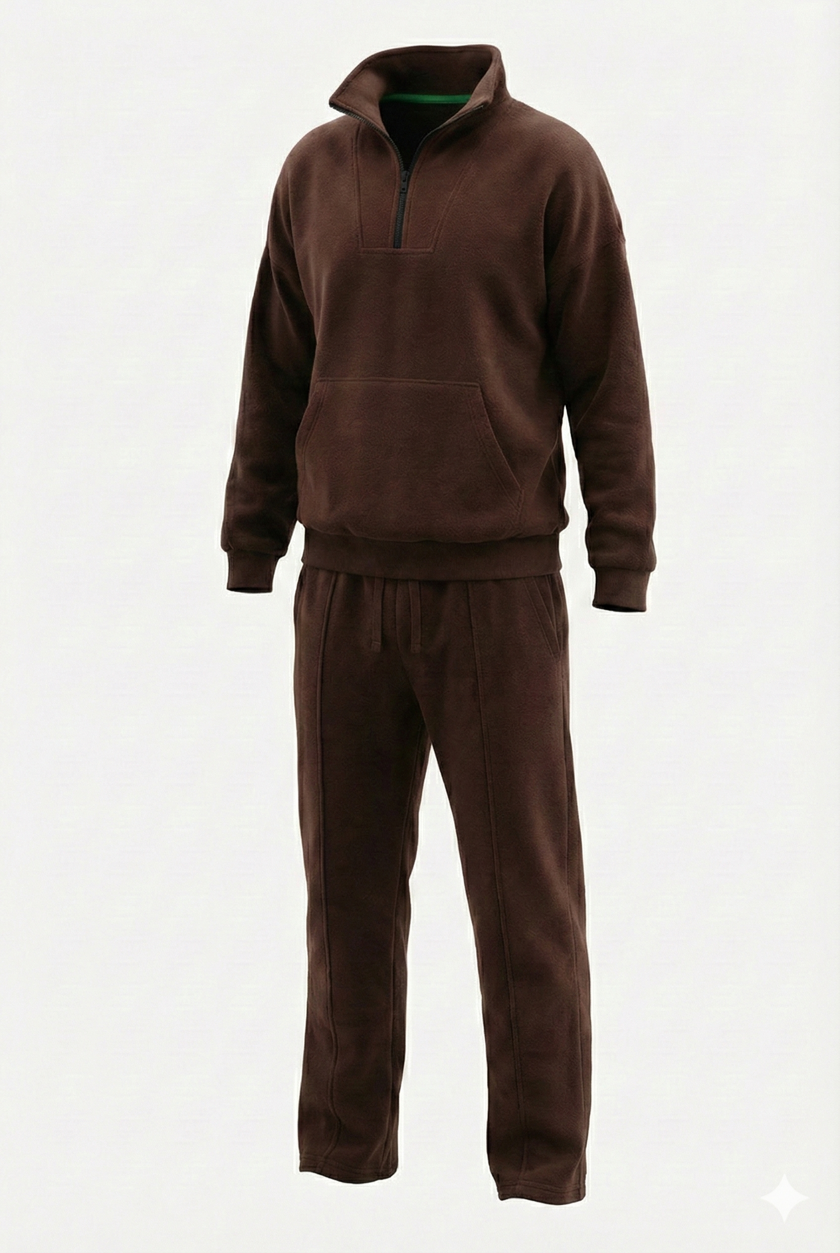 The upper features a robust half-zip pullover with a structured funnel neck and a distinct contrast black zipper, giving it a technical, modern edge. It pairs seamlessly with the matching trousers, which are cut for a relaxed yet straight fit, featuring defined seam details that maintain structure even after hours of wear.