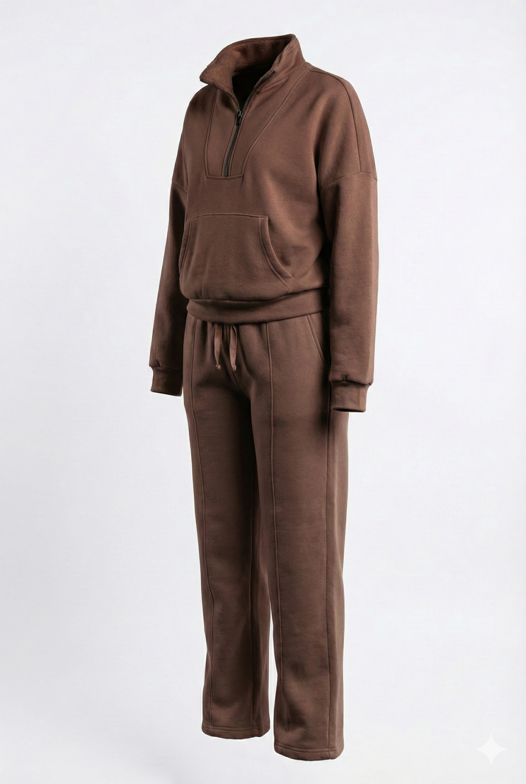 The ensemble features our signature half-zip pullover, distinguished by a sleek contrast black zipper and a high funnel neck that frames the face. It is paired with matching wide-leg trousers that feature a permanent central pintuck seam, creating a tailored vertical line that elongates the leg and elevates the look beyond standard sweats.